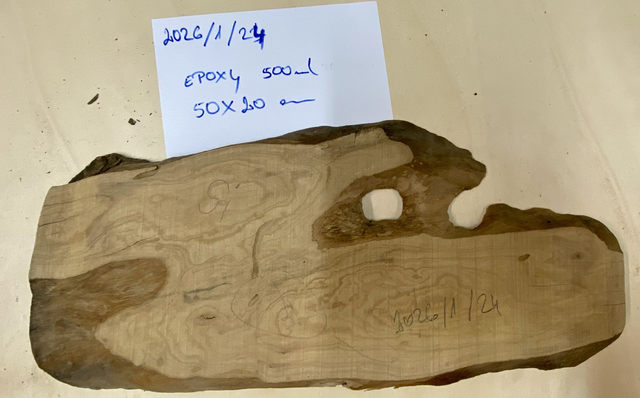 A large-format bespoke olive wood board, where natural cracks and grain movement are intentionally preserved and stabilized with epoxy.