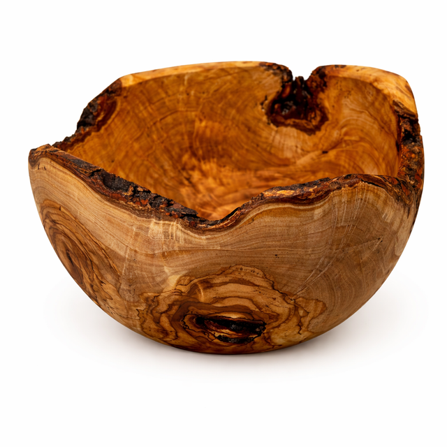 This round live edge bowl is handcrafted from authentic Tuscan olive wood, highlighting the tree’s natural grain, warmth, and organic character.