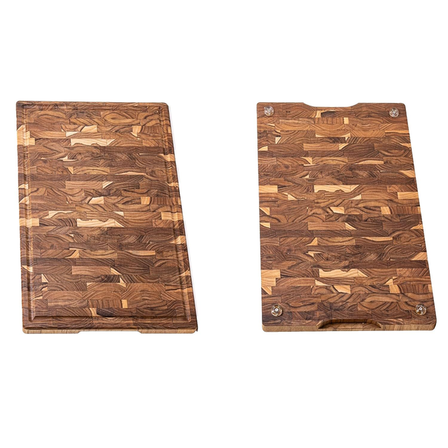 Each board is carefully finished, then sealed with food-safe oil to enhance its deep golden tone and unmistakable grain. The integrated juice groove keeps countertops clean and organized — perfect for preparing meat, fruit, or high-moisture ingredients.